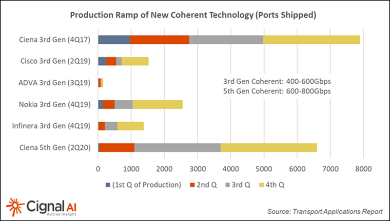 In just over nine months of commercial availability of WaveLogic 5 Extreme, Ciena has shipped more than 6,000 coherent modems to over 75 customers around the globe, all of whom are actively deploying the technology in their networks. The rate of early technology adoption is impressive - more than twice as fast as the ramp of competitive 600G solutions, as can be seen from the Cignal AI graph below (source: Transport Applications Report).