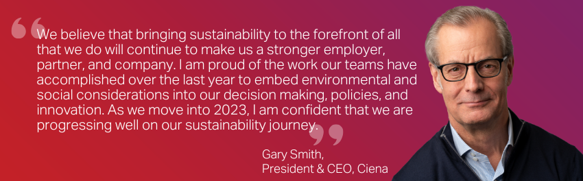Over the last year, at Ciena we have continued on our journey by increasing our sustainability resources, establishing new environmental goals, further investing in our people and empowering them to show their passion for their communities. We recently shared our progress across these areas in our 2022 Sustainability Report. Throughout this report, we share details on some of the programs and goals that our teams are working towards across a number of sustainability topics.