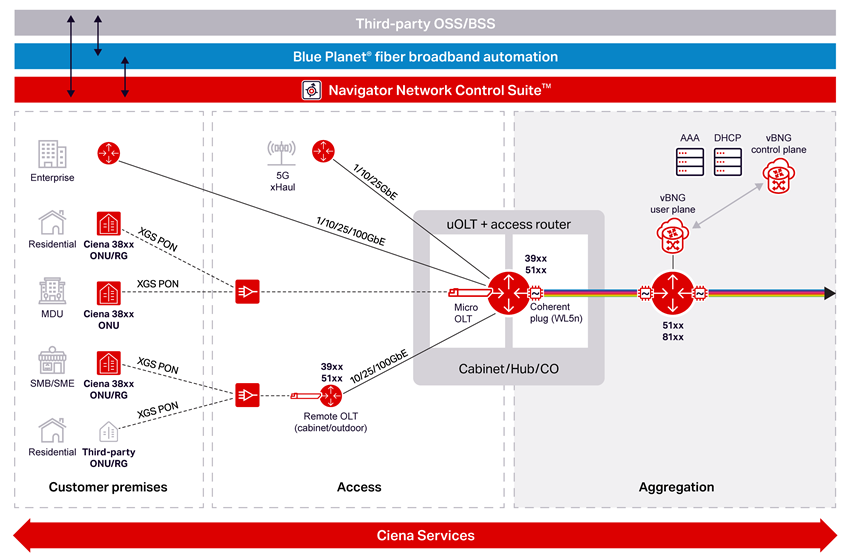 Ciena’s broadband solution features a comprehensive portfolio of host routers and switches, including outdoor weatherized options. This enables PON to be deployed anywhere in the access network, including remote rural locations.