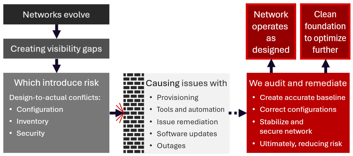 As you know from experience, networks don’t stand still. They evolve over years—often decades—shaped by growth, technology shifts, IT leadership preferences, and changing operational priorities. Through this evolution, gaps in visibility emerge. Inventory insight becomes incomplete. Configurations drift. Security inconsistencies appear. These design-to-actual conflicts create inefficiencies that impact provisioning, automation, troubleshooting, routine upgrades, and even introduce outage risk.