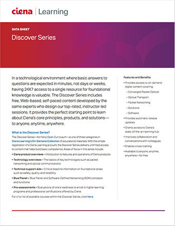 The Discover Series—formerly Open Curriculum—includes free, Web-based, self-paced content developed by the same experts who design our top-rated, instructor-led sessions. It provides the perfect starting point to learn about Ciena’s core principles, products, and solutions—to anyone, anytime, anywhere.