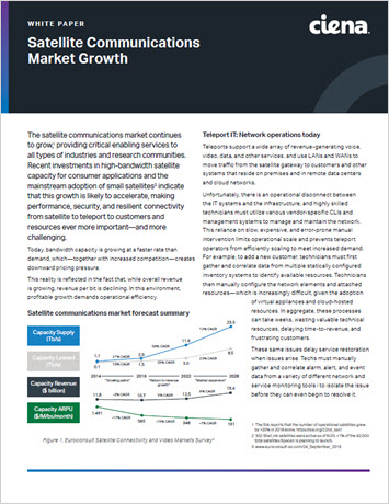 Teleport operators are being challenged to manage ever more satellites, bandwidth, and mission-critical applications and services while managing complex LANs, WANs, fiber-based terrestrial/submarine infrastructure, and hybrid cloud networks that span the globe. Cost-effectively managing this complex mix of physical/virtual infrastructure with outdated operational processes and proprietary tactical tools is increasingly impractical. Modern software-centric automation is the answer. Backed by a world-class services organization and the expertise of first-rate system integration partners, Ciena's Blue Planet software helps teleport operators overcome the myriad technical and business challenges they currently and consistently face, allows them to enhance their customers’ experience at scale, and facilitates their digital transformation goals.